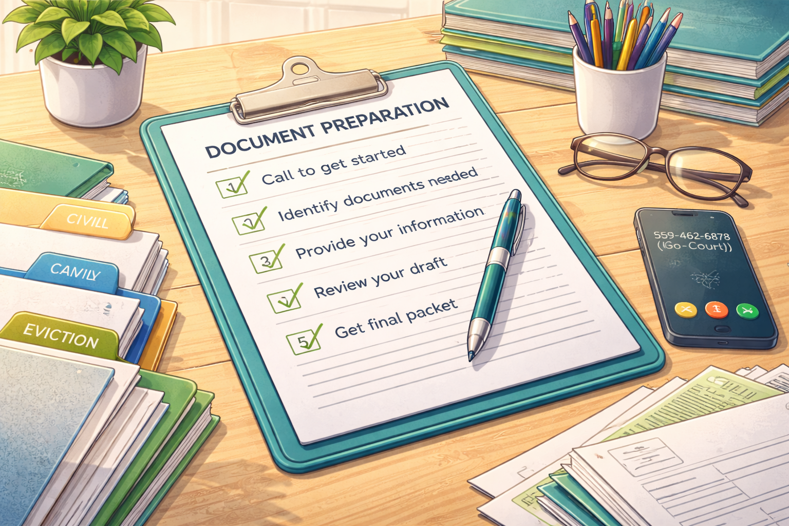 Eviction cases move fast and require strict paperwork. We help landlords and tenants prepare and organize documents for common steps in an unlawful detainer case. We do not represent anyone in court and we do not give legal advice.